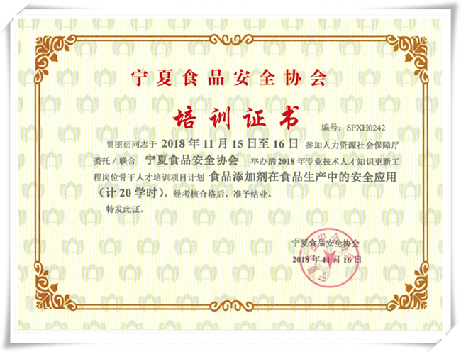 寧夏食品安全協會培訓結業證書